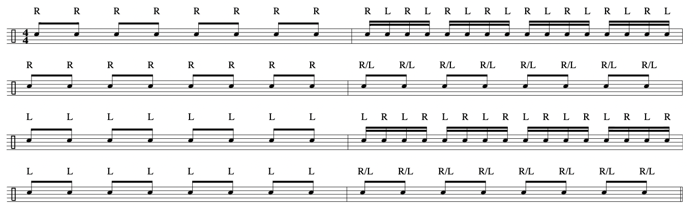 Es un concepto muy sencillo pero muy potente a la vez y a mi me sirve para desarrollar precisión y resistencia… o más bien eficiencia, este recurso yo lo utilizo muy a menudo como calentamiento para antes de tocar conciertos o grabaciones ya que me ayuda a centrarme en el aspecto más básico y más general de todo lo que toco, que son golpes simples tocados continuos, unísonos, y alternos.