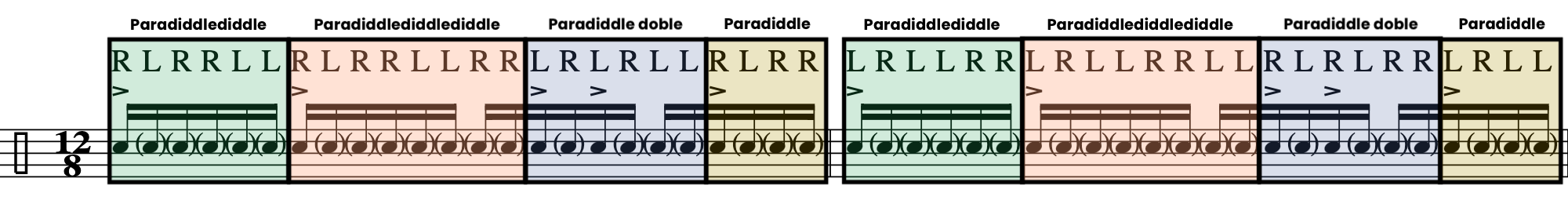 Lo que va a determinar qué palo flamenco tocas con estos paradiddles es la velocidad de estos. En orden de más lento a más rápido: soleá, soleá por bulería, alegría, bulería.Paradiddlediddle: R l r r l l ó L r l l r r Paradiddlediddlediddle: R l r r l l r r ó L r l l r r l l Paradiddle doble: R l r l r r ó L r l r l l Paradiddle simple: R l r r ó L r l l