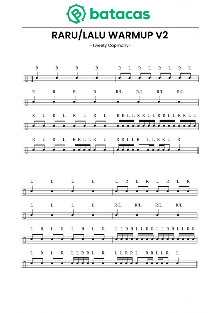 [Índice]R significa Right (derecha), L significa Left (izquierda), A significa Alternos, U significa unísonos. En el método RARU/LALU directamente pasábamos del primer ejercicio que te dejo al segundo. Puedes practicarlos separados y después juntarlos, pero en cuanto agreguemos la variación, el orden será RARU - VARIACIÓN - LALU - VARIACIÓN.