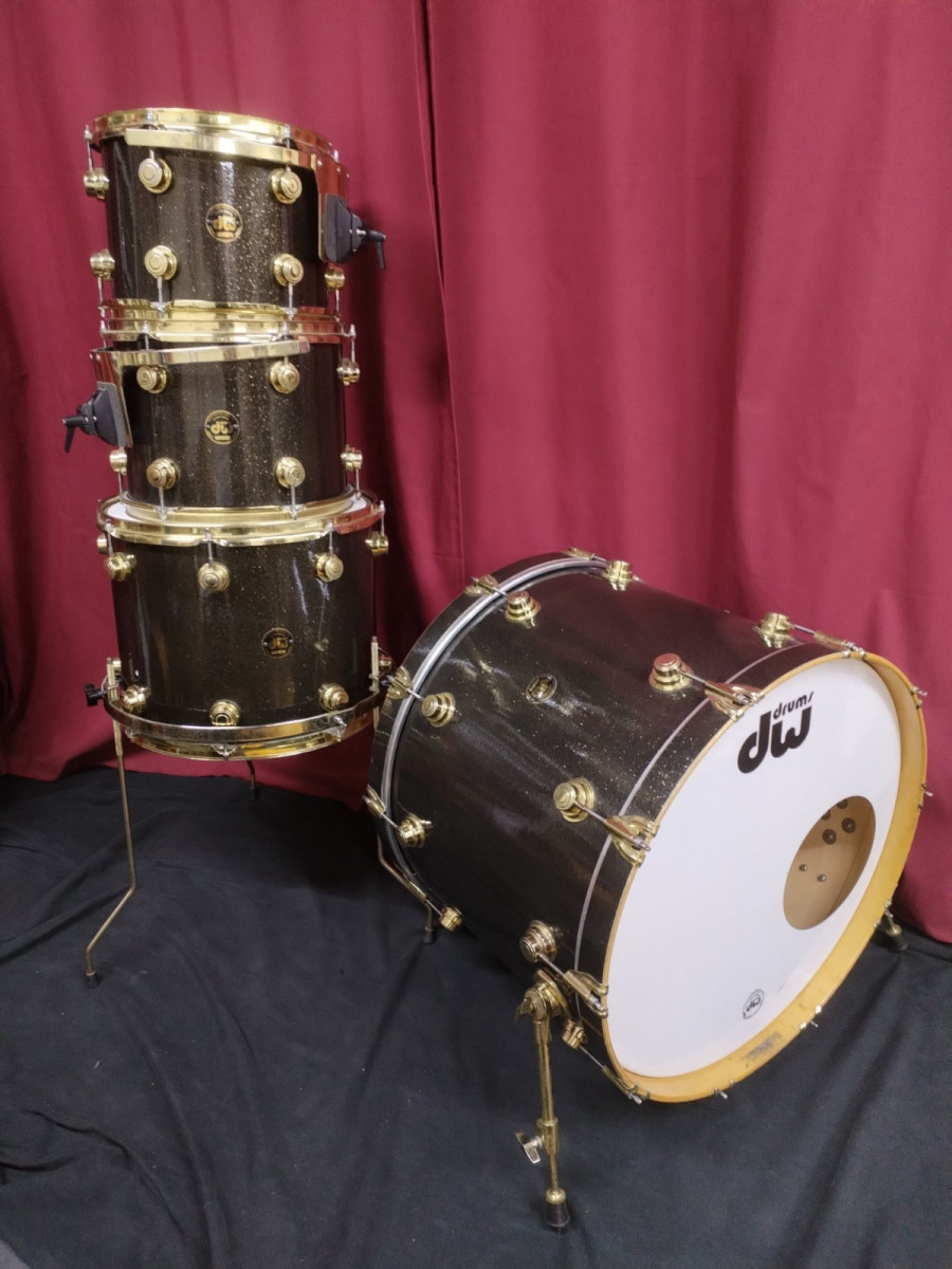 Los toms ( incluido el 16" ) llevan el sistema de soporte RIMS también en acabado "oro" y las patas del 16" también son doradas.