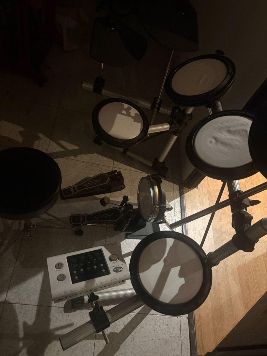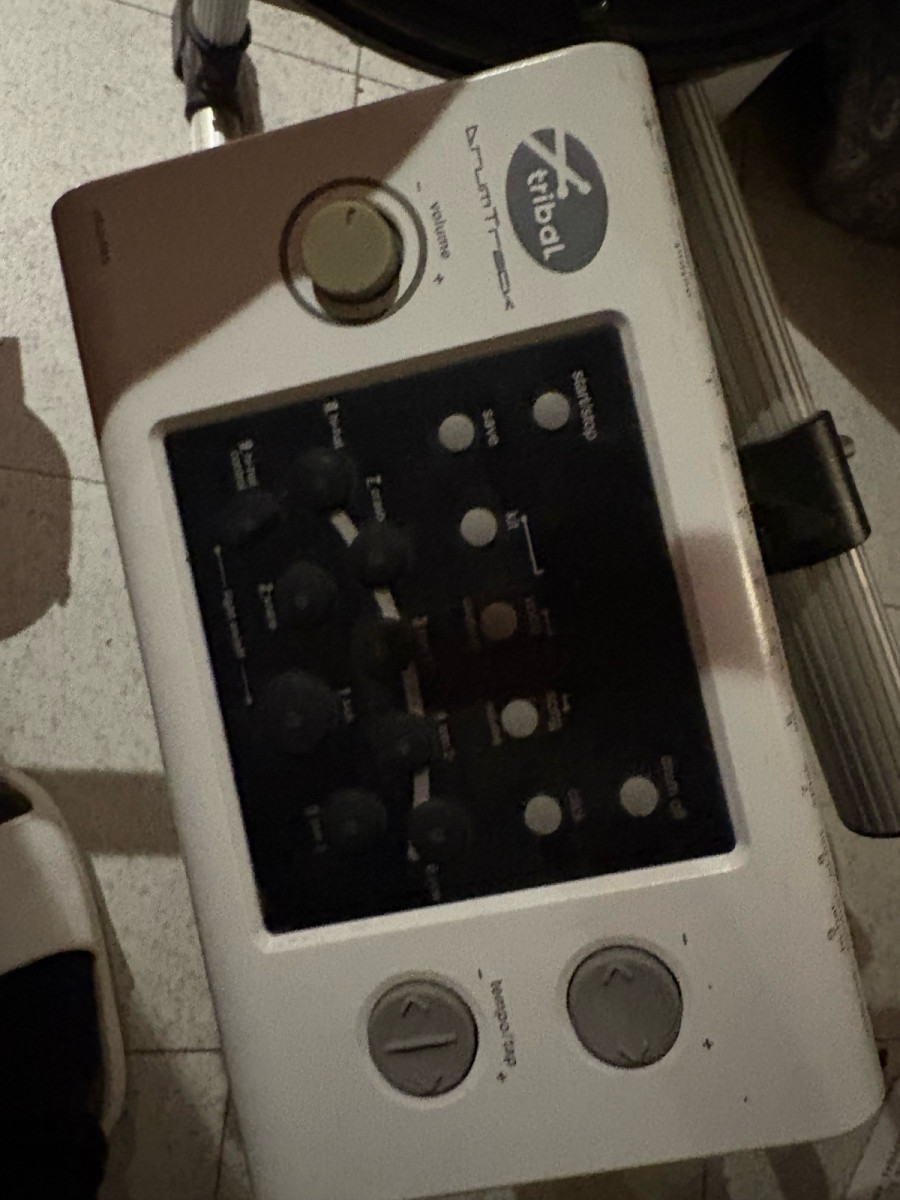 Batería electrónica tribal con todos sus componentes, también incluye los cables y la fuente de alimentación.
