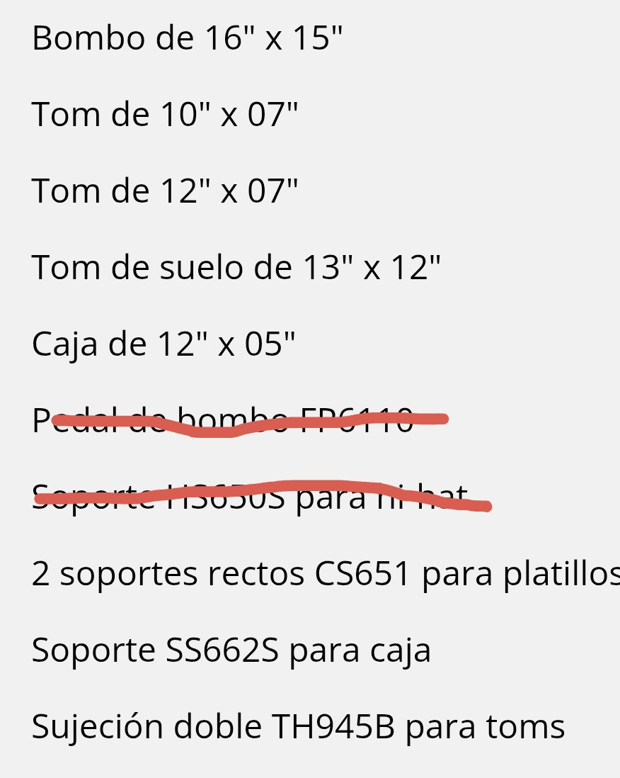 - Todos los herrajes incluidos (excepto pedal de bombo, soporte Hi-hat y taburete)