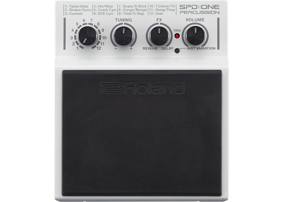 SPD :: One Percussion Este pad de color blanco nos trae la posibilidad de disponer de 22 sonidos de percusión real pregrabados: Cajas, bombos, hi-hats, panderetas… Este pad – como los demás de esta serie- puede tocarse con baquetas, manos y/o pies.