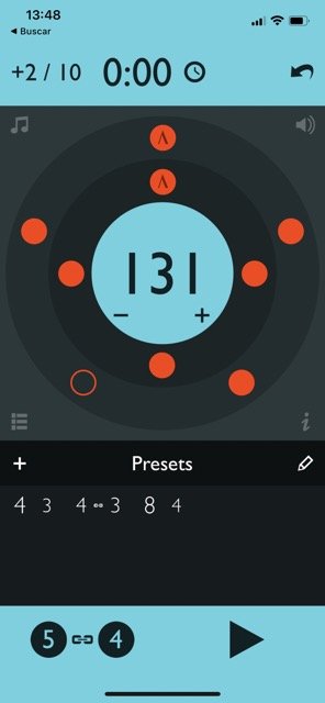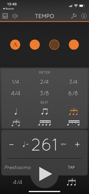 [Índice]Esta estación de trabajo que se llama Tempo desarrollada por Frozen Ape es sin duda la app que más utilizo. Tiene un diseño muy sencillo e intuitivo además de personalizable con sonidos de claqueta y colores a tu gusto. En sus diferentes modos (concierto, práctica, repertorio y básico) hay numerosas opciones muy convenientes. Mi favorita de estas opciones es automator, que permite subir o bajar el tempo en intervalos de compases o segundos para poder practicar cosas complejas cada vez más rápido o más lento sin necesidad de parar el metrónomo y establecer un tempo nuevo. Esto es una gran ventaja a la hora de aprovechar nuestro tiempo disponible de estudio, sean 8 horas u 8 minutos. También su modo coach permite dejar compases en silencio para poner a prueba nuestro tempo interno y la función tracker te permite establecer la duración de tu ejercicio o rutina.