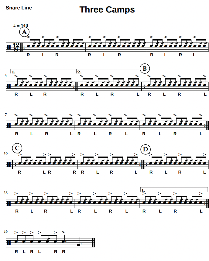 He aquí algo interesante: también puedes tocar "The Three Camps" como un ejercicio de redoble continuo con acentos. En este caso, piensa en los redobles como invertidos, comenzando con un solo acento y resolviéndose con golpes dobles. El objetivo, al utilizarlo como ejercicio, es tocarlo tan rápido como sea humanamente posible siempre respetando una articulación pristina, ya que esta pieza se interpreta con más ejecutantes y ha de ser identificable.
