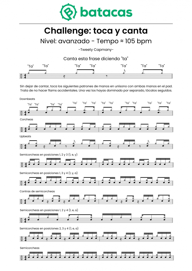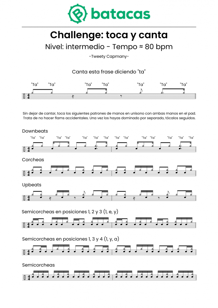 [Índice]En el challenge para principiantes vamos a hacer con las manos las 4 figuras básicas. Negras (downbeats), contratiempos de corchea (upbeats), corcheas y semicorcheas. Lo que haremos será tocar cada una de estas figuras en unísono con las dos manos en el pad y cantar a la vez. Presta atención a no hacer flams.