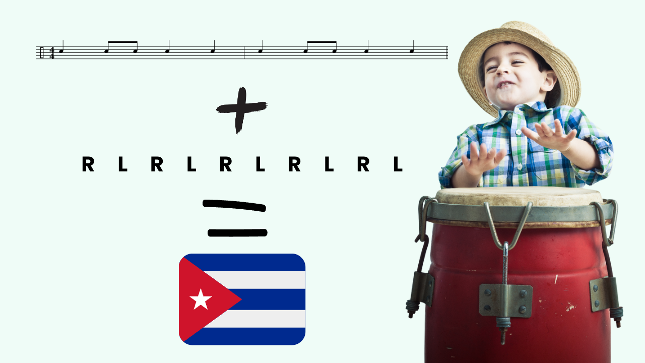 De primeras, esto no es muy emocionante si se toca en la caja, pero ¿Qué pasa si ponemos cada mano en una superficie de la batería? De repente podemos escuchar claramente una frase que hace la mano derecha y otra que hace la mano izquierda.Dale a Play en el ejemplo y fíjate bien en qué hace cada mano. Tómate un tiempo en escuchar detenidamente ¿Sabes lo que es? ¡Exacto! ¡Es la clave de son! La mano derecha está haciendo la clave en su forma 3:2 y la mano izquierda está haciendo la clave en su forma 2:3
