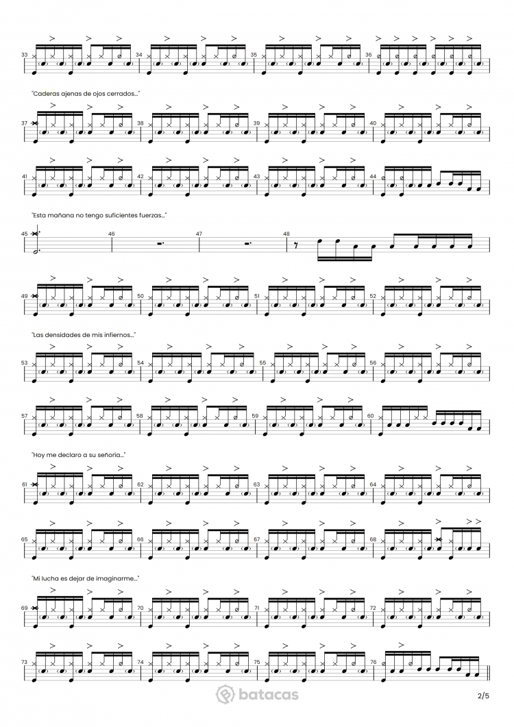 Tanto la intro, como la larga estrofa tienen como base un groove que se divide en 2 partes. En ambas partes contaremos con upbeats en el hi hat que dotan al tema de una sensación de huida hacia adelante y velocidad. Para aderezar esto, una incesante mano izquierda estará rellenando las semicorcheas con notas fantasmas y acentos que aparecerán en los backbeats y en el contratiempo de la 5ª corchea del 6/8. Mucha atención a los momentos donde hay una nota fantasma seguida de un acento, ya que la ejecución correcta de ese mini fragmento será lo que defina si el ritmo camina o no.