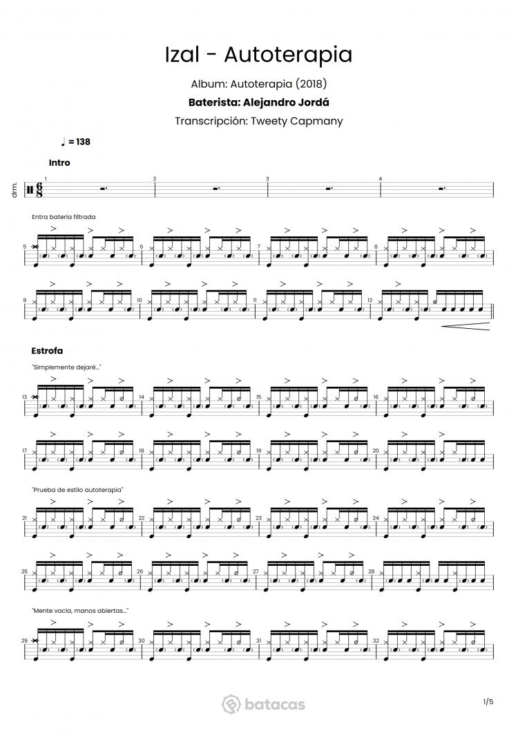 Hace unos días preguntamos en nuestra cuenta de Instagram qué canciones de grupos españoles tenían baterías que llamasen la atención y cuáles de estas quería la comunidad que fuesen transcritas en partitura. Una respuesta común ha sido la referente a la canción Autoterapia que abre el disco homónimo de Izal lanzado en 2018.