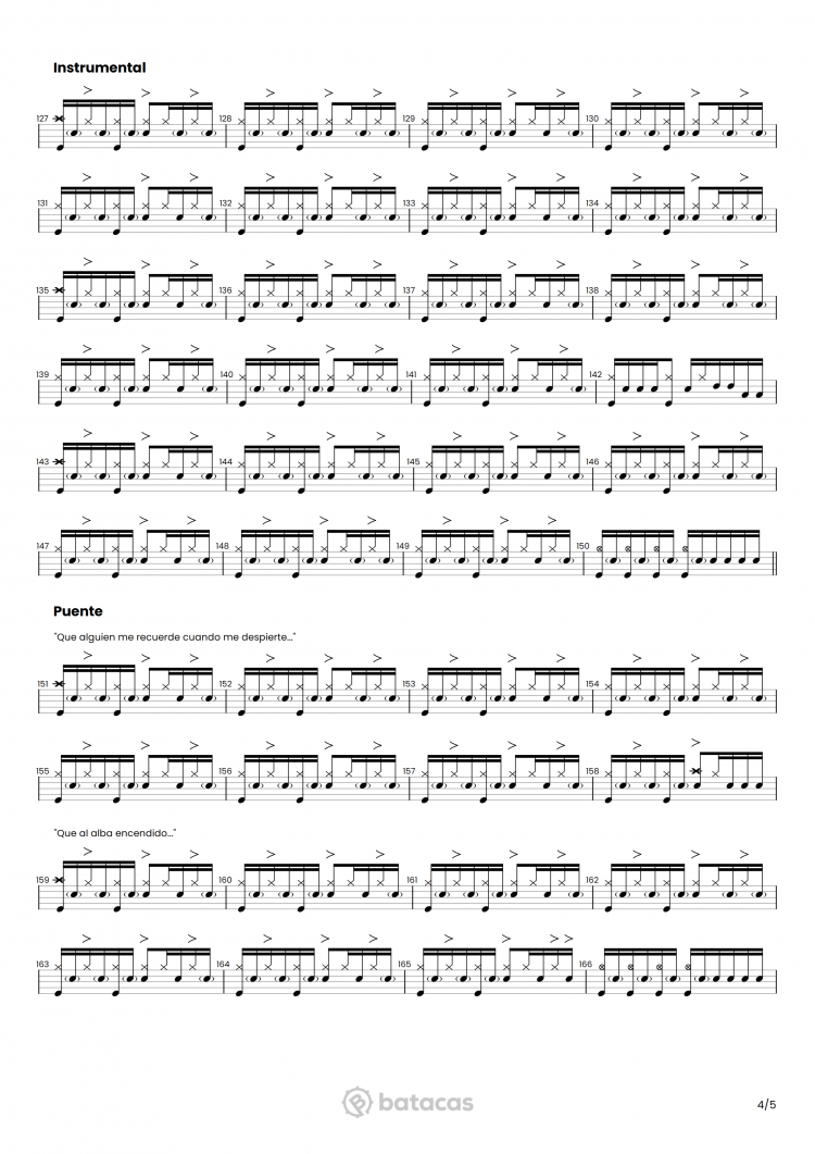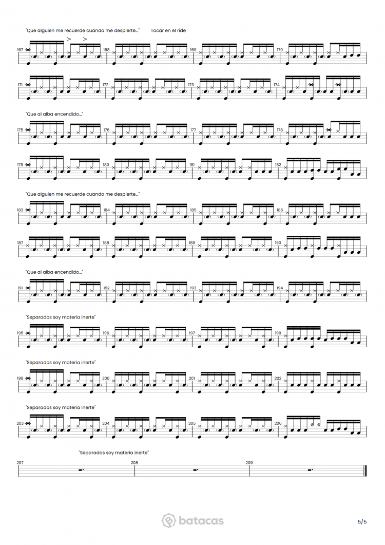 Tras esto, viene una parte instrumental seguida de un puente donde volveremos al groove inicial de la intro y la estrofa. Ya entrada la parte vocal, volveremos a desplazar la mano del hi hat al ride. En esta parte además hay una plétora de fills de nuevo, que, si quieres calcar el estilo de Alejandro Jordá puedes hacer tal cual están escritos o crear los tuyos propios.