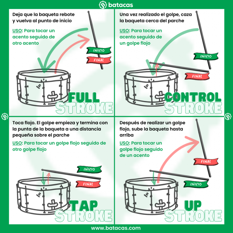Aquí tienes una guía visual de los tipos de golpes en batería.