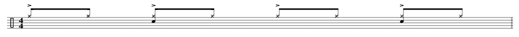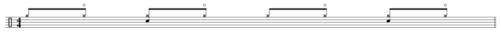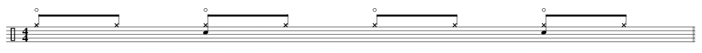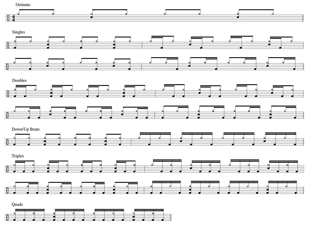 Para practicar esta técnica, nos enfocamos en los golpes de corchea con la mano dominante, backbeat en caja en los tiempos 2 y 4 del compás y trabajamos en el bombo todas las combinaciones posibles de 1, 2 e incluso 3 golpes consecutivos de bombo dentro de un tiempo de negra.