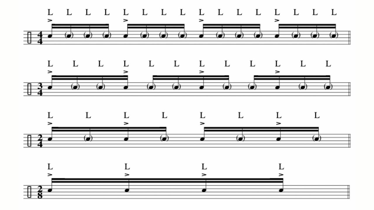 [Índice]- 4 grupos de cuatro notas: la primera nota se acentúa y las tres siguientes se tocan sin acento (son ghost notes).