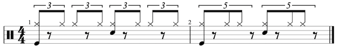 Si quieres practicarlo a la vez, aquí hay una partitura interactiva. El software de notación que utilizamos para estos artículos es GrooveScribe y no permite escribir quintillos, así que hacemos la representación en 5/4 para poder escuchar el efecto que produce.
