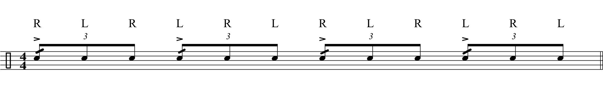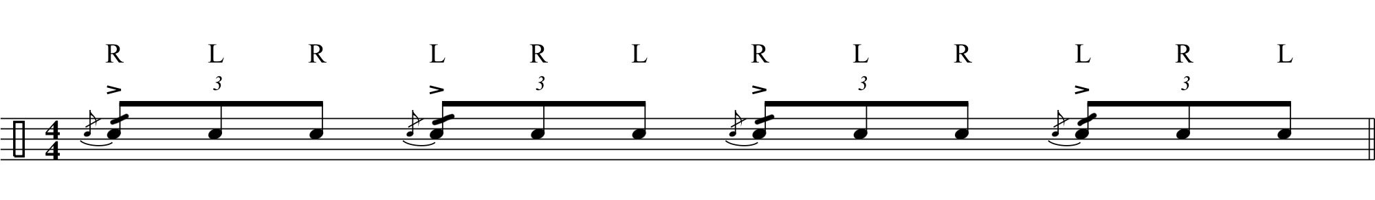 Ahora, esos acentos son sustituidos por flams. Mi recomendación para que este rudimento es que la mano con la que se hace el acento del flam, se levante realizando un golpe “up” en la segunda nota del tresillo y tener bien en cuenta que el resto de notas van a ejecutarse con la punta de la baqueta cerca del parche.