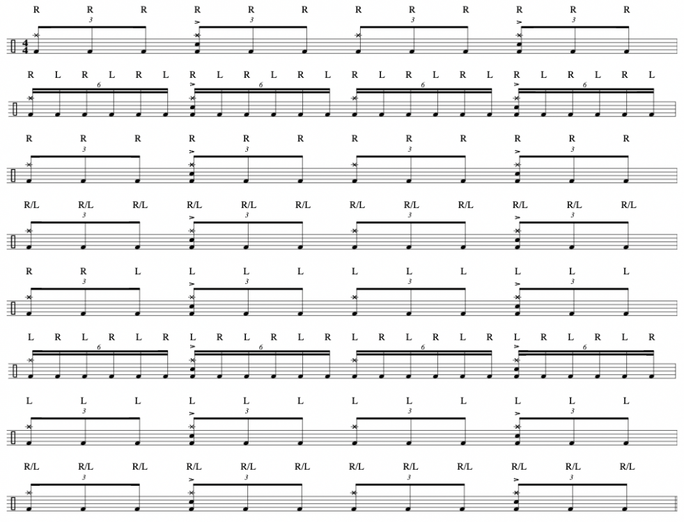 [Índice]No sólo de semicorcheas vive el doblepedalista. En vez de corcheas y semicorcheas, vamos a mover esto a tresillos y seisillos. El método RARU LALU puedes pasarlo también por una pirámide de subdivisiones como hicimos en este vídeo en nuestra cuenta de Instagram o hacer diferentes modificaciones. Aquí tienes un ejemplo con tresillos y seisillos.