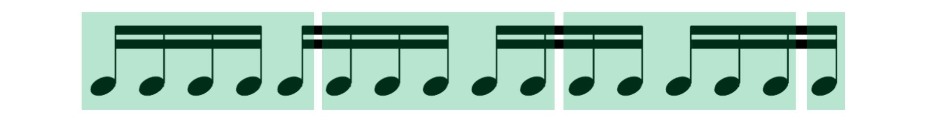 - Pasa esta misma fórmula a otros compases: 3/4, 6/8, 7/8 y fíjate cuántas repeticiones deberás hacer de los grupos de 5 para que cuadren en la subdivisión.