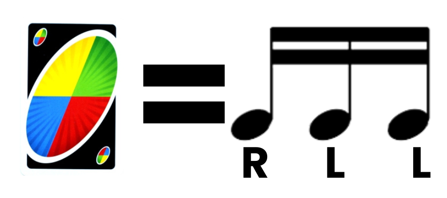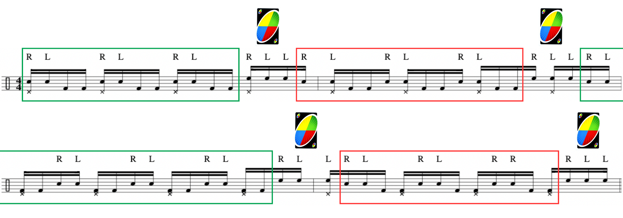 Para ello podemos utilizar una variación de nuestro cambio de sentido que será el cambio de color, que nos permite movernos entre el primer grupo de dos stickings y el segundo. El funcionamiento de esta carta es muy parecido al de la de cambio de sentido, pero en vez de tocar dos notas en el timbal, tocaremos 3 notas con un sticking RLL. Puedes utilizar otros stickings o tocar solo una nota en vez de 3, pero esta es la manera más efectiva que he encontrado para interiorizar el concepto.