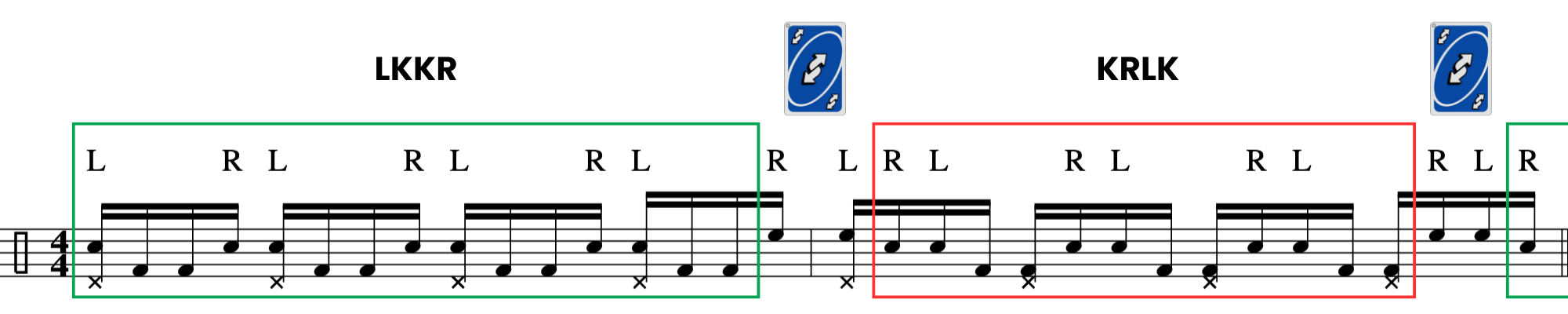 El equivalente a esta carta de sentido es simplemente tocar 2 notas (R L) en el timbal después del golpe doble de bombo y entonces volver a la caja para hacer 2 notas seguidas de dos bombos. Elijo el timbal concretamente porque está cerca, las dos manos acceden con la misma facilidad y nos va ayudar a diferenciar el momento carta de cambio de sentido al ser un sonido nuevo.