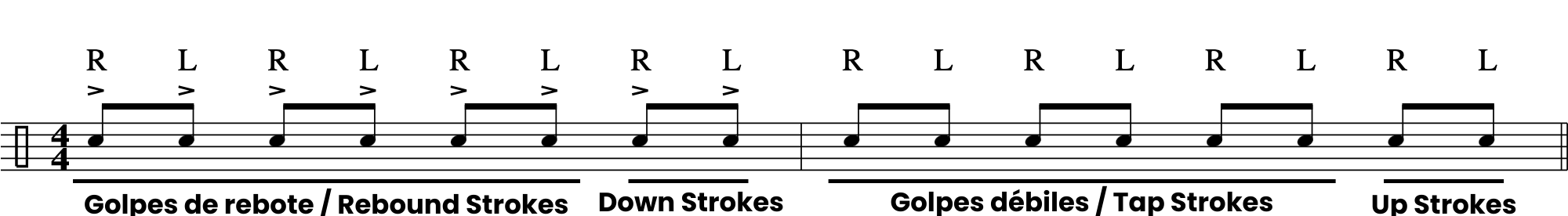 Este ejercicio es de gran interés técnico, ya que utilizaremos los 4 tipos de golpes básicos. En los primeros 8 golpes, los 6 iniciales son rebound strokes, seguidos de 2 down o control strokes. Estos últimos dejan las manos preparadas cerca del parche para esta vez ejecutar 6 tap strokes seguidos de 2 up strokes que volverán a colocar la punta de la baqueta arriba para repetir el ciclo. Si no sabes qué son estos tipos de golpes, tienes una guía visual aquí.